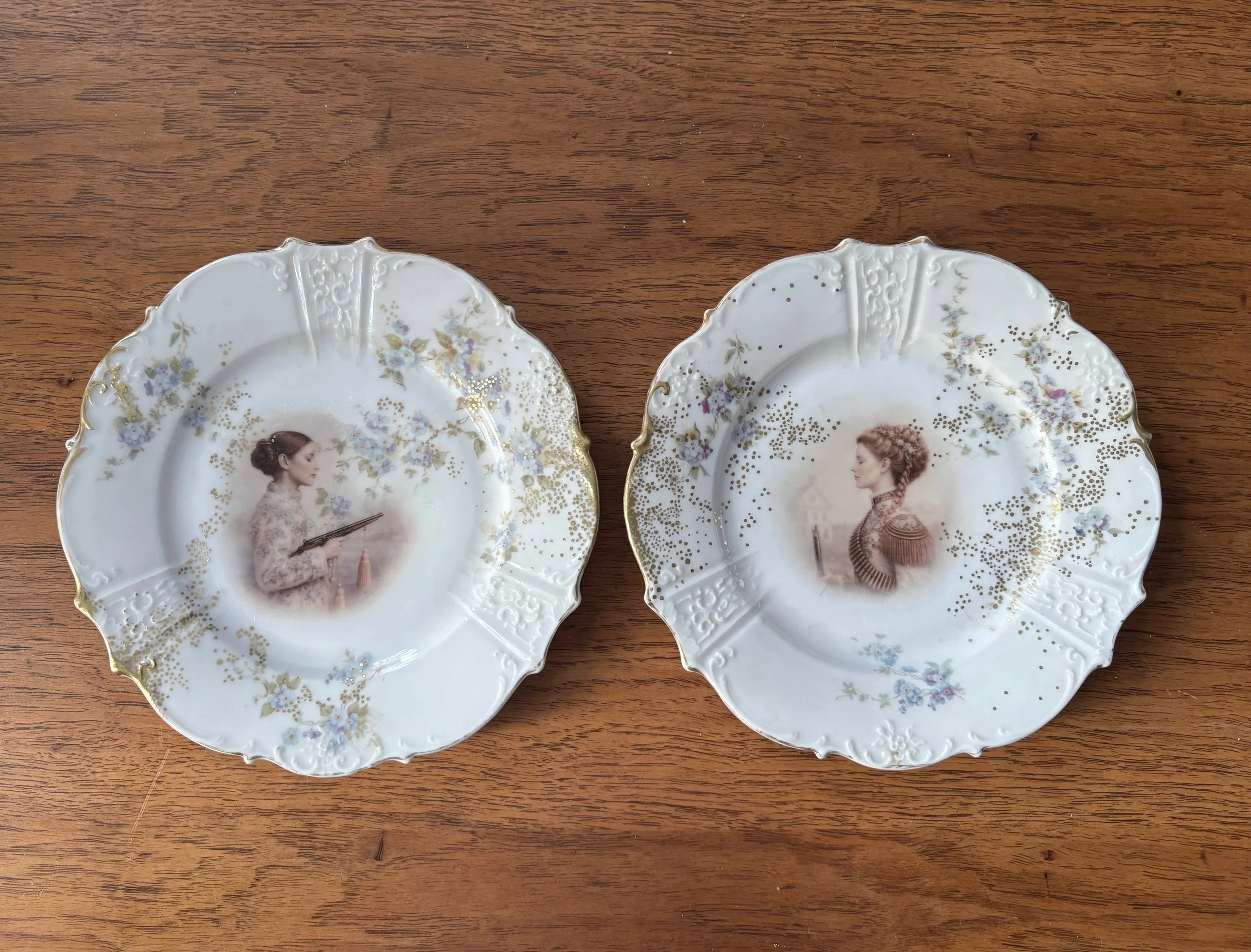 “These companion plates present two women in quiet profile, suspended within delicate garlands of blue florals and gilt detail. Facing one another across space, they evoke dialogue across generations — sister to sister, ancestor to descendant. The vintage porcelain, once decorative and domestic, becomes a ground for reclamation. By layering contemporary portraiture onto heirloom surfaces, the work reframes traditional femininity: not passive, but resolute; not ornamental, but enduring. The plates function as both relic and resistance — intimate objects transformed into vessels of memory, lineage, and quiet strength.'“