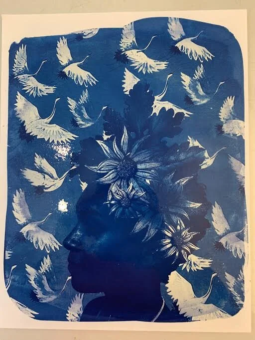 Earlier this July I was inspired to try a new art making process, which was diving into the process of cyanotype making. According to Google, “Cyanotype is a 170 year old photographic printing process that produces prints in a distinctive dark greenish-blue. The word cyan comes from the Greek, meaning “dark blue substance.” The process was invented by Sir John Herschel, a brilliant astronomer and scientist, in 1842.”